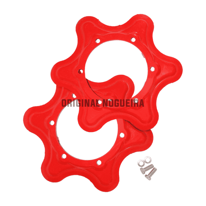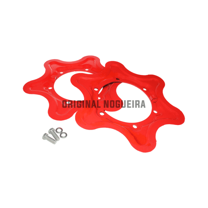 KIT DE FACAS ORIGINAIS EM FORMATO ESTRELA DO ROLO RECOLHEDOR DA COLHEDORA DE FORRAGENS NOGUEIRA MODELOS FTN 1000, NEW PECUS, NEW PECUS CANAVIEIRA E NEW PECUS DUO. KIT COMPLETO COM 2 FACAS, 12 PARAFUSOS E 12 ARRUELAS.